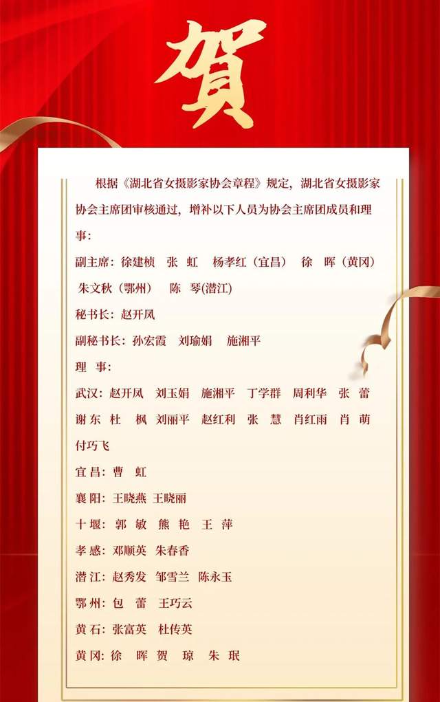 2022年5月5日,根据《湖北省女摄影家协会章程》规定,湖北省女摄影家协会主席团审核通过,增补部分人员为协会主席团成员和理事:副主席:朱文秋(鄂州),理事:包蕾、王巧云(鄂州)。