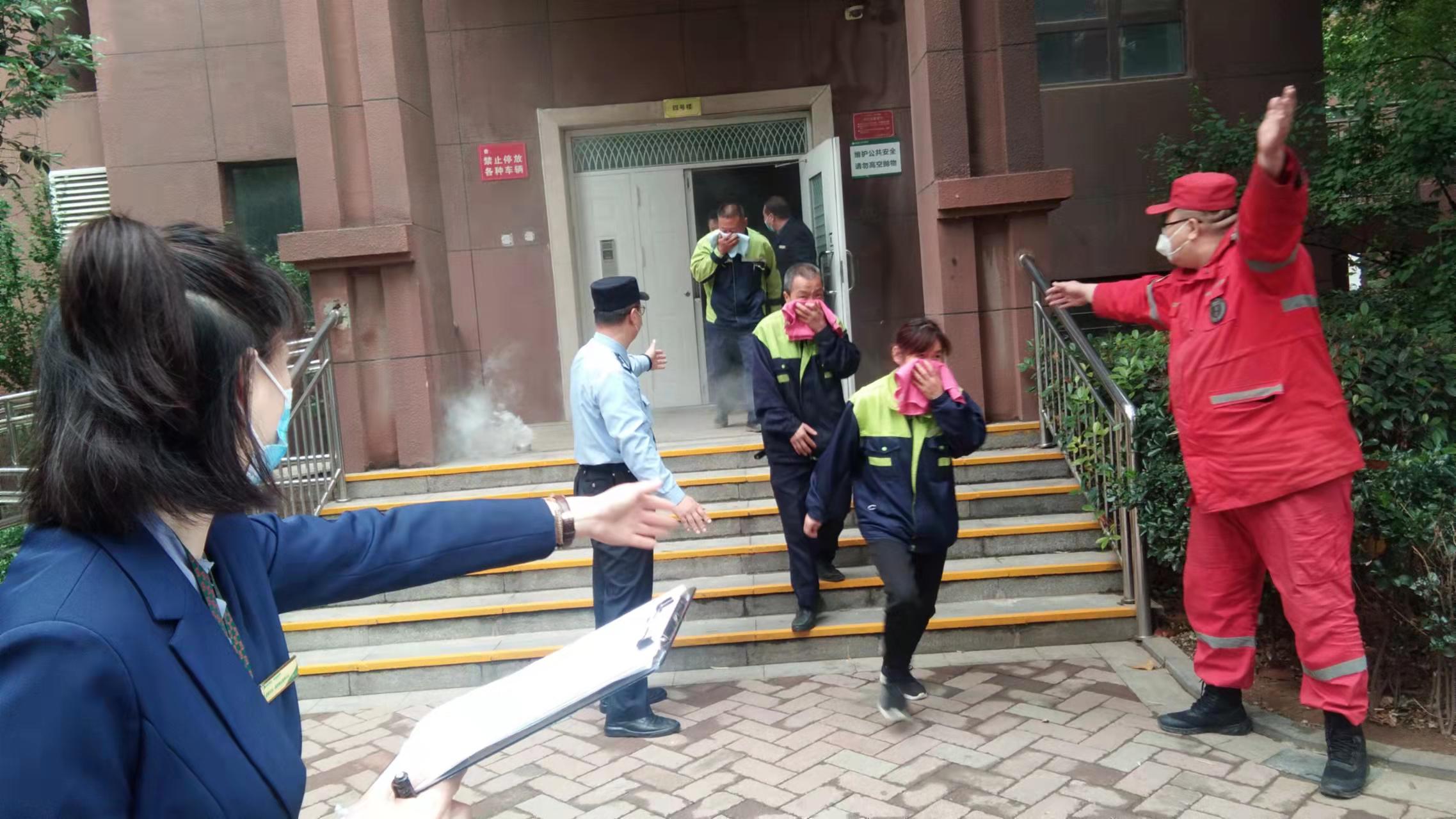 随着“应急警报”铃声的响起,一居民楼下冒出滚滚浓烟,消防演练正式开始。物业人员迅速组织居民,通过楼梯进行紧急疏散,相关人员在第一时间赶到疏散路线拐角处,配合指挥疏散人员紧急转移。在有效指挥下,疏散人员用湿毛巾掩着口鼻,弯腰前行,有序小跑,按照指定路线迅速进行紧急疏散,并快速撤离到安全地带。