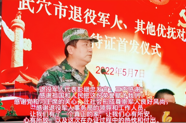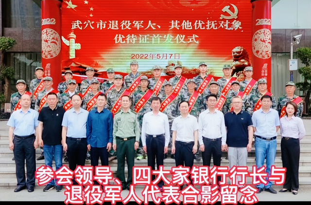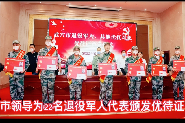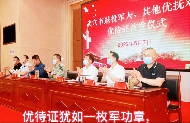 小小优待证,浓浓拥军情。5月7日,在武穴市退役军人和其他优抚对象优待证首发仪式上,王炜、彭继忠、李振豪等22名优抚对象代表在市委常委、人武部长曹广库、副市长、公安局局长胡新志、市政府办副主任蔡何苗、市退役军人事务局局长蔡俊军以及四大家银行行长等领导的共同见证下参加了优待证首发仪式。这标志着武穴市退役军人和其他优抚对象优待证发放工作已经正式开始。