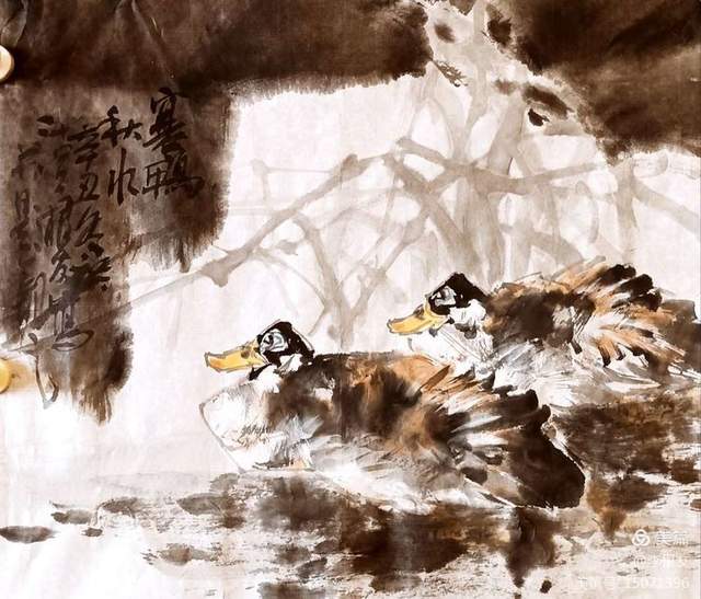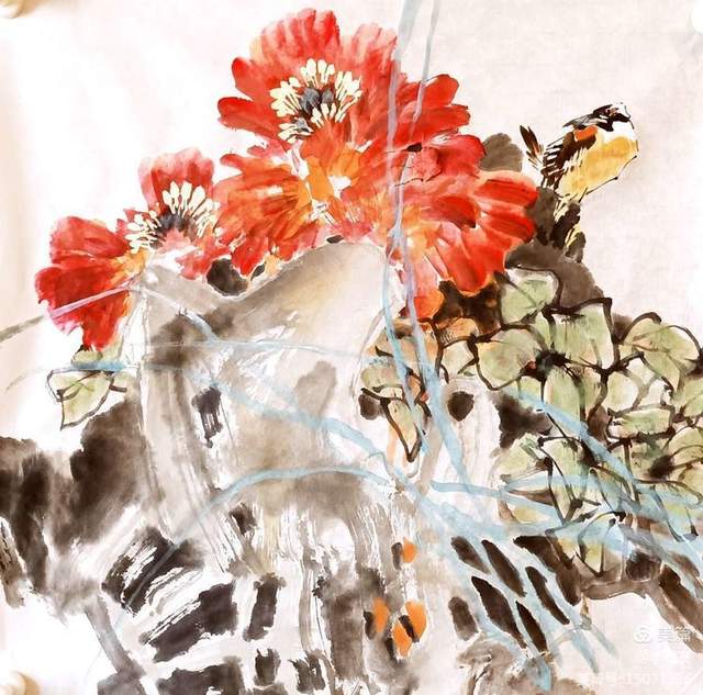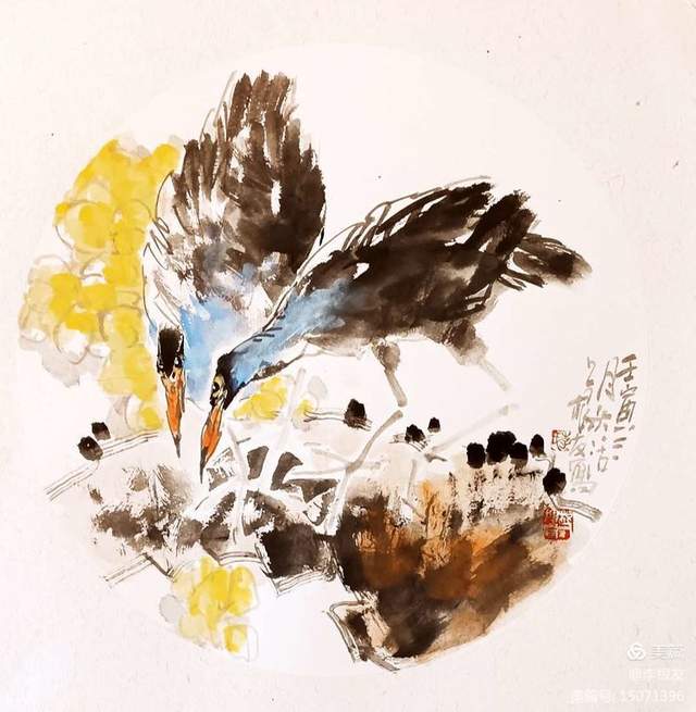 我的花鸟画在早先大量临摹天津孙其峰先生、萧朗先生绘画技法的基础上,对特点进行了研究,加以自己喜欢画鸟,对它也情有独钟,像是梅妻鹤子之意。所以画出来的鸟都有表情。象是会说话会交流的鸟。这实际上就是我心里的鸟,我想画的鸟。我把它人格化了,做了夸张的变形处理。新面目的出现自然也就有了我的形象“根友鸟”。我画的鸟基本上都是“意象鸟”,没有具体名称,但您看了并不感觉奇怪,因为它没有脱离现实,依旧是一只活生生的鸟。像是离您很近。这种“意象鸟”适合搭配各种花卉,不受局限(除了固定体裁)。灵活性较强,所以打破了原有的欣赏习惯,把具象转换成了意象,使传统的模式有了变化,不再是具象的鸟,熟脸的鸟。在鸟的创新我从认真地观察、临摹、研究,经历了探索、实践、创新等几个阶段。