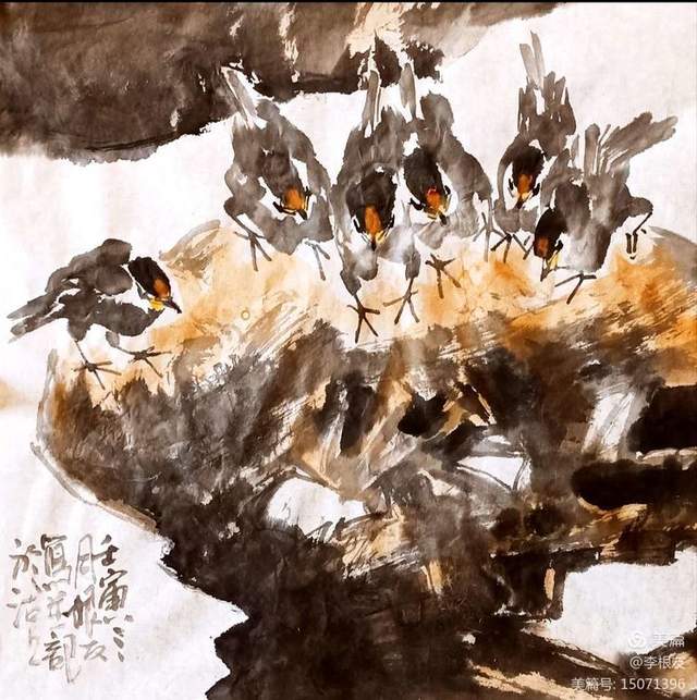 天津画圈聊起花鸟画,大家都有一个话题“根有鸟”。为什么叫“根有鸟”?因为这个花鸟画中长画的鸟,画家李根友有了自己独特的艺术表现形式和造型,所以大家称李根友老师画的花鸟画中的鸟叫“根有鸟”因此“根友鸟”已经成为了他的一个艺术符号。