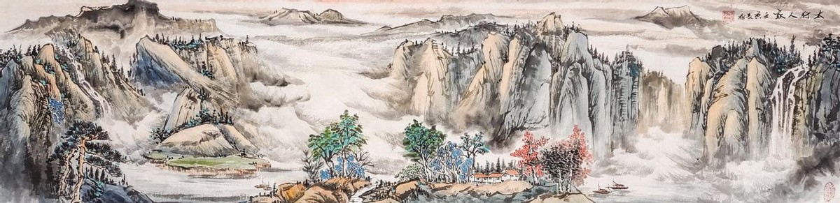 作品讲述:画面表现的是太行山山村的生活景象。雄伟壮观的大山连绵起伏、云雾缭绕,山里涓涓细水汇成奔腾的湍流,一泻千里、壮观无限。山下形成清澈的潭水。在河流中山民划船打鱼,在安静的大山深处,他们靠大山的馈赠幸福地生活。