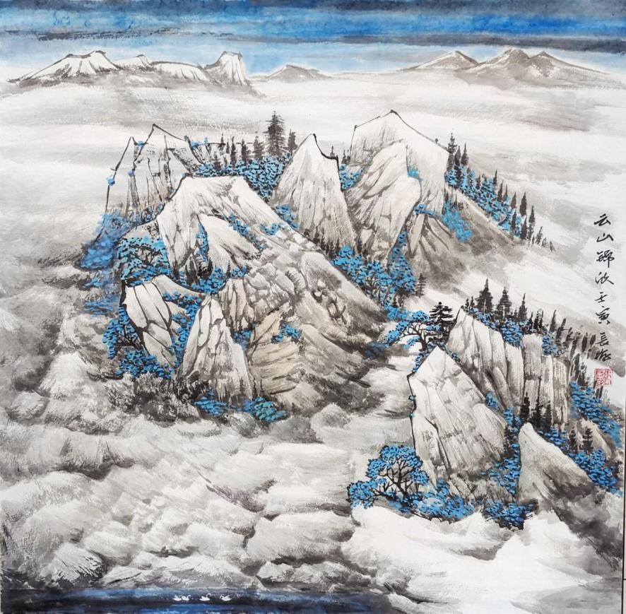 2021年,作品《俯瞰天地日月新》入选北京“太行之首北派山水名家白石山专题展”。