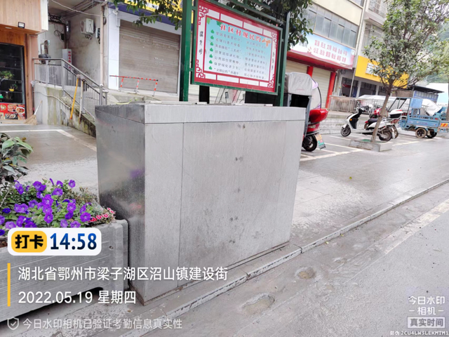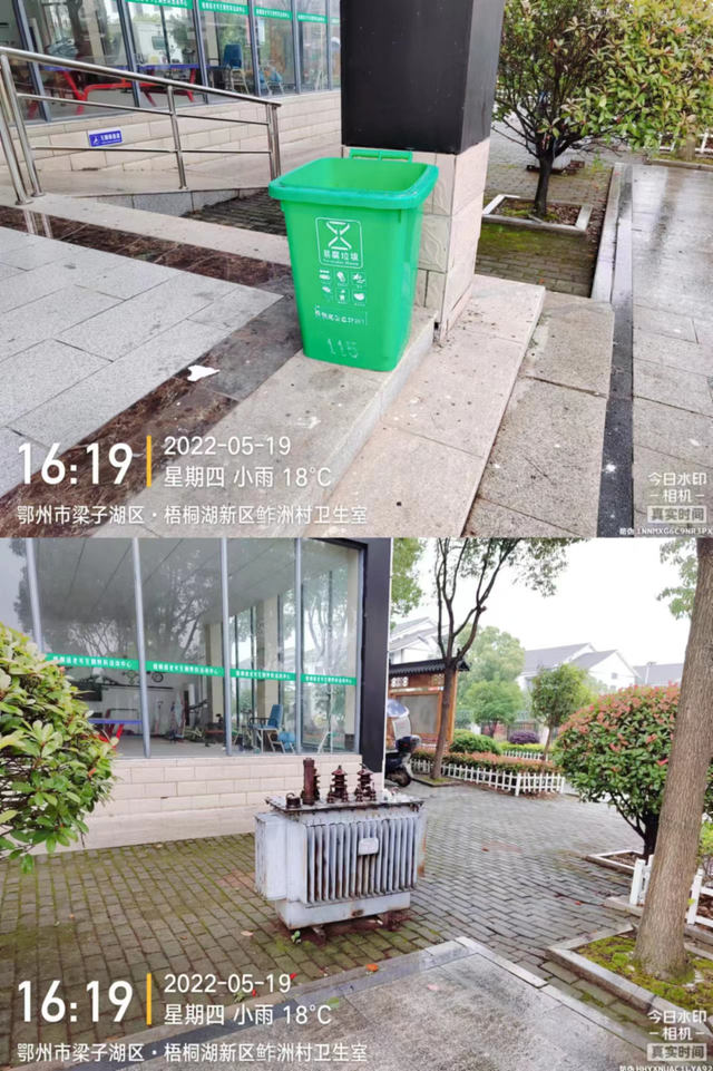 鲊洲村新时代文明实践站垃圾桶摆放不规范,有杂物堆积