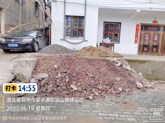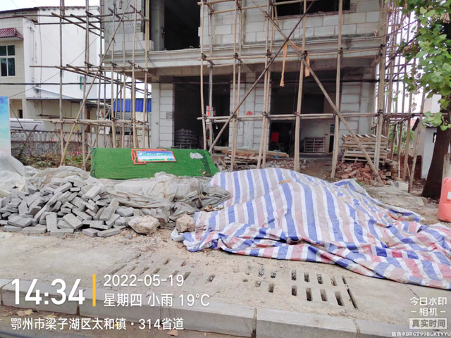 314省道与建设路交汇处居民楼前建筑材料随意堆放
