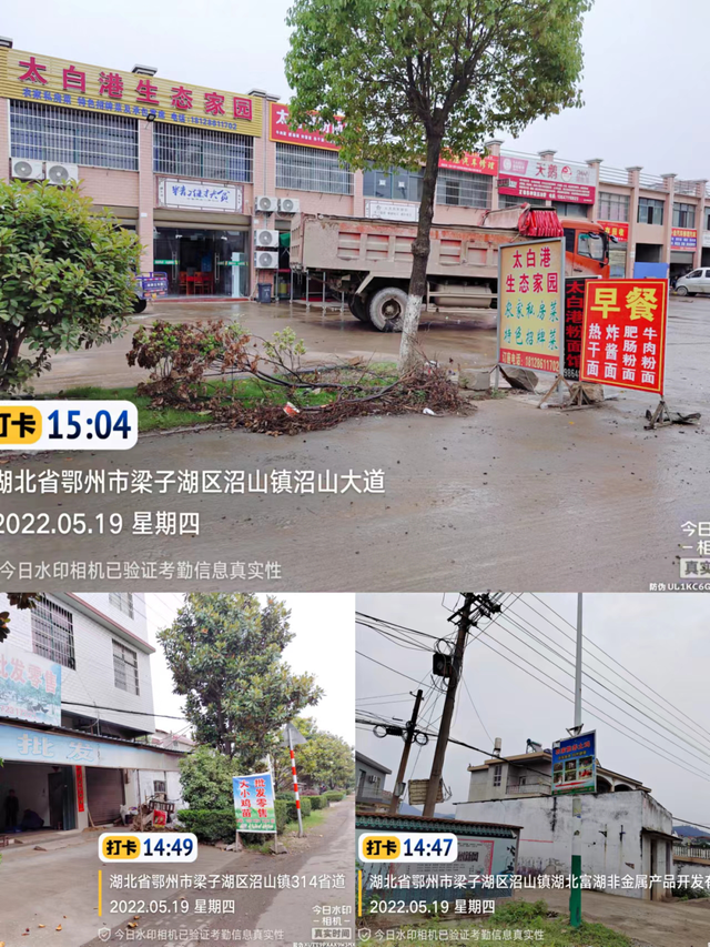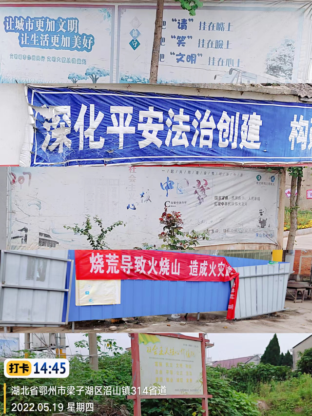 省道靠近朱山东路段有多处过期横幅和公益广告;沼山镇多处落地广告占道