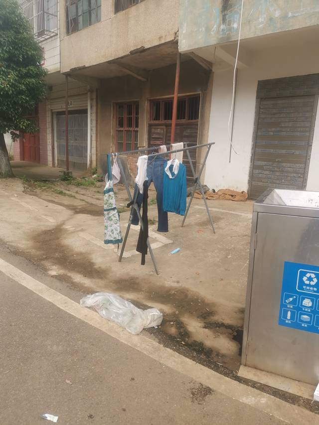 建设路有居民当街晾晒、地上有白色垃圾