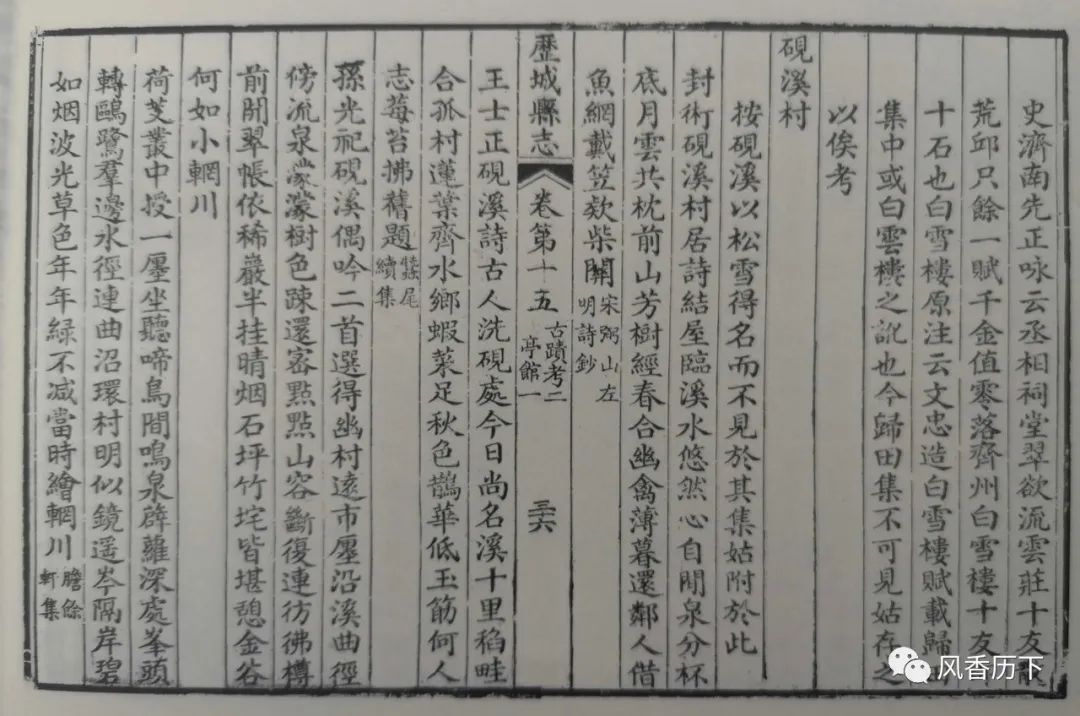 清代,诗人咏歌砚溪村的诗作所在多有。仅收录于乾隆《历城县志》、民国续修《历城县志》中的,便有王士禛、孙光祀、任弘远、董芸、范坰、廖炳奎、韩崇的九首诗作,然而,这还不是砚溪村诗作的全部。据笔者所见,除此之外,尚有许多。