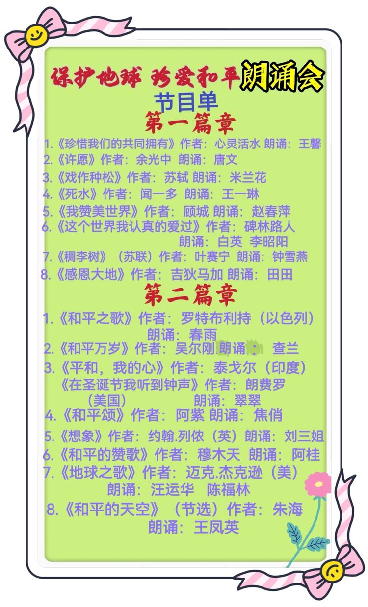 朋友们!让我们一起行动起来吧,为维护世界和平,保护地球环境尽自己的一份力量。敬畏自然,保护动物,人与自然和谐相处,让世界充满爱。今晚有18位诵友在朗诵会中闪亮登场,各位老师的精彩发挥再次体现诗歌带给我们的快乐与幸福。期待我们下月再见!