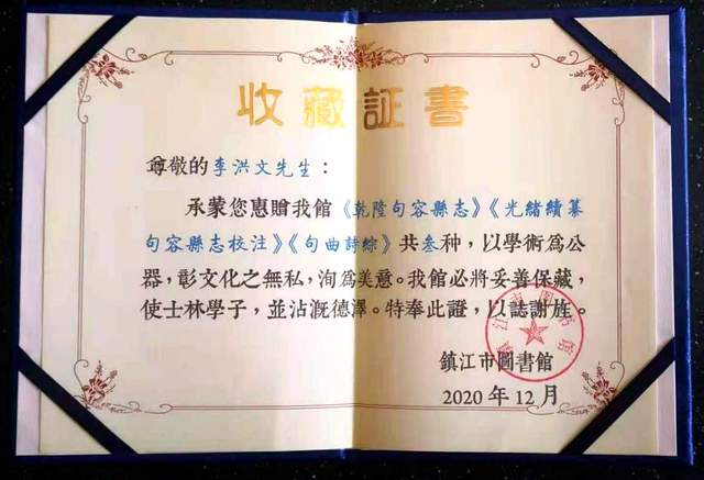 镇江市图书馆颁发给作者《收藏证书》。