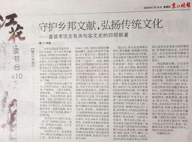 ↑祝诚教授《京江晚报》(2020.7.16)介绍作者四书之“喜读李洪文有关句容文史的四部新著”书评。