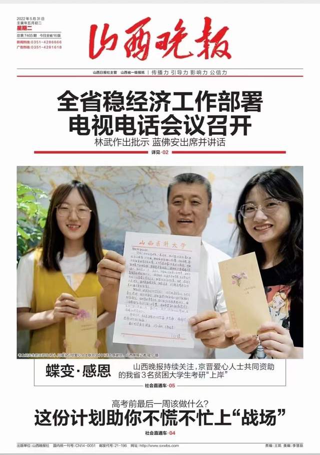 她眼界打开,立下雄心壮志,冲刺名校;她懂得了不骄不躁,找到自己的节奏,坚持付出终有收获;她学会了接受自己的不完美,面对困难不再胆怯,而是积极解决问题……从贫穷的小山村走进美丽的大学校园,一路有爱陪伴,她们在象牙塔里激扬青春、挥洒汗水、蜕变成长。5月30日,山西晚报持续关注,由京晋两地爱心人士共同资助的山西贫困大学生闫瑾、王妙玲、郁燕杰传来喜报,她们分别考取第四军医大学西京医院麻醉学研究生、山西财经大学会计学研究生、长安大学电子信息专业研究生。今年9月,三人将开启人生的新征程,继续在各自的专业领域拼搏进取。