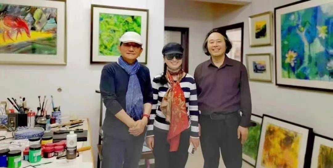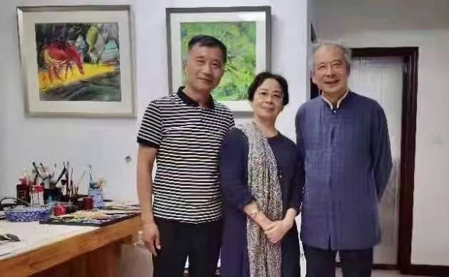 著名雕塑家刘瑜女士(中)、原扬州市文联主席刘俊先生(左)、原扬州市文物局局长顾风先生(右)来仓爱民画室指导绘画艺术创作
