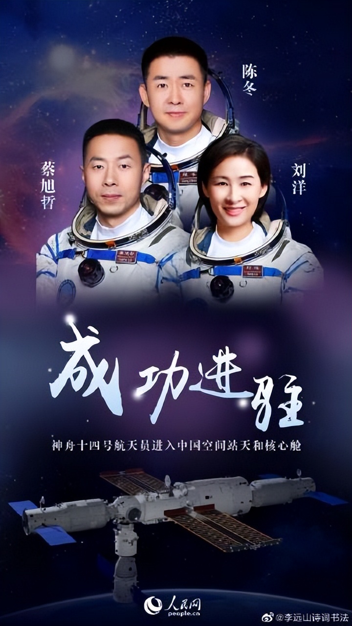 今天怀着激动的心情,热烈祝贺神州十四号飞船发射取得圆满成功,并顺利对接空间站。向航天员陈冬、刘洋、蔡旭哲三位英雄致敬!想起曾为中国航天六十周年,北京飞控中心成立二十周年纪念,远山应邀采写了《航天赋》获全国一等奖,并悬挂在北京飞控中心贵宾室大厅。还为航天员女英雄刘洋写了诗书作品,我特别高兴,祝她们顺利完成航天工作任务,胜利凯旋。