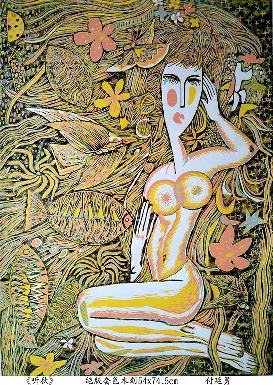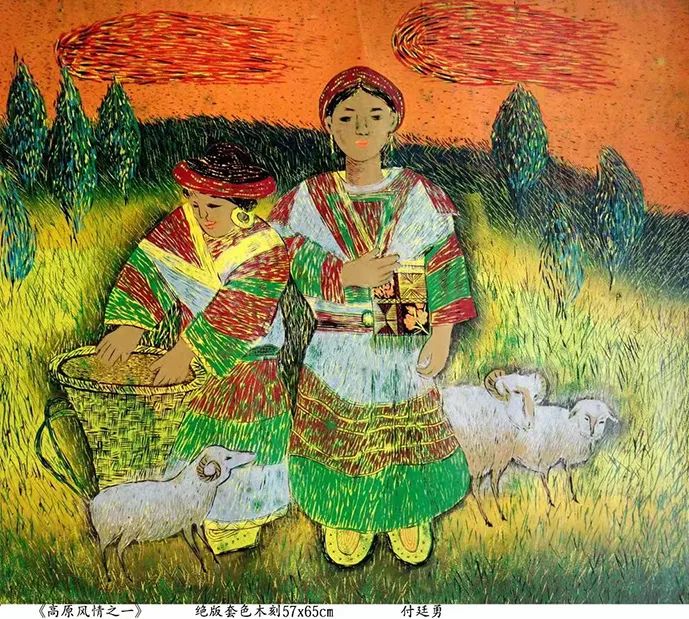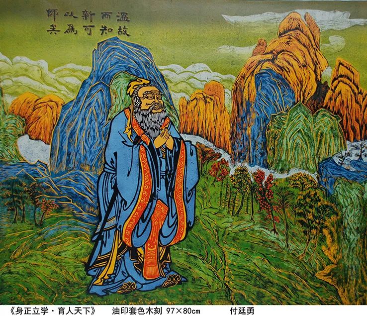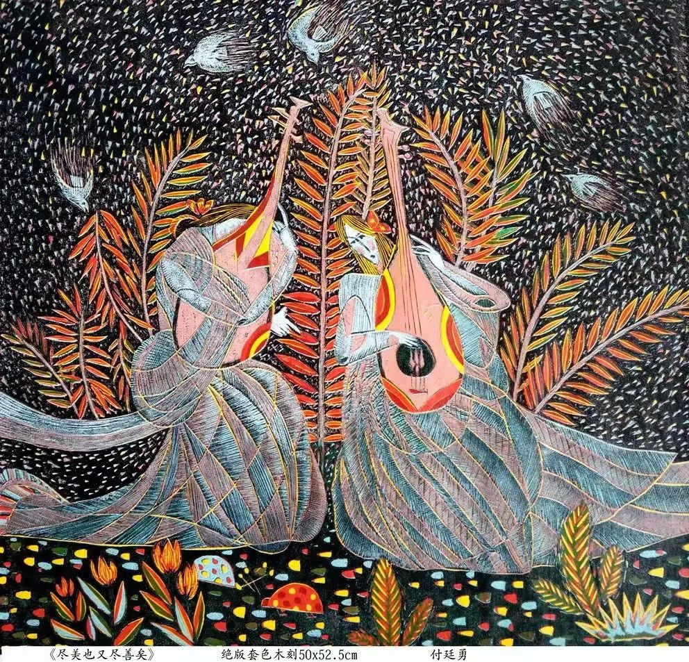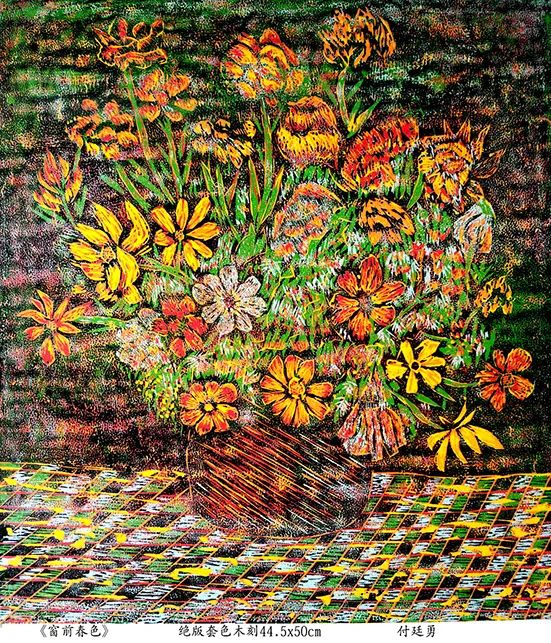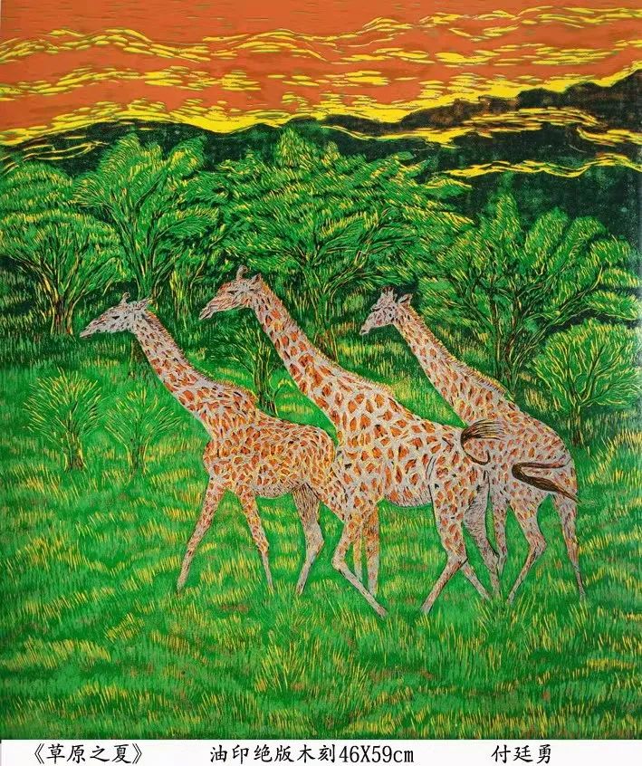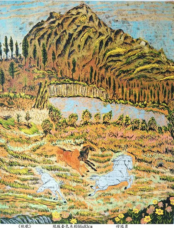 付廷勇就是倾其毕生精力,对版画孜孜以求的艺术家。其重视版画的“刀味”和“木味”,“以刀代笔”,用力作画,从画面上的每根线条、色点、色块见体悟版画的用刀之妙,从而让每一刀雕凿及其整体构图都臻于完美。精益求精,刀耕不辍,这是一条孤独的旅途,一条探寻的道路,同时也是精神内涵,意境和内在情感的表达。在付先生眼中,刀法之于木刻,就如同笔墨之于国画,刀与木的碰撞是一种独特的艺术语言,在版画中体现独特的艺术价值和审美个性,创作者应将版画本体语言以最具感染力的形式充分发挥出来,恰到好处地表达艺术家对所处时代、社会、文化的审视和思考,创作出具有表现力和生命力,具有精神内涵和文化力量的作品。