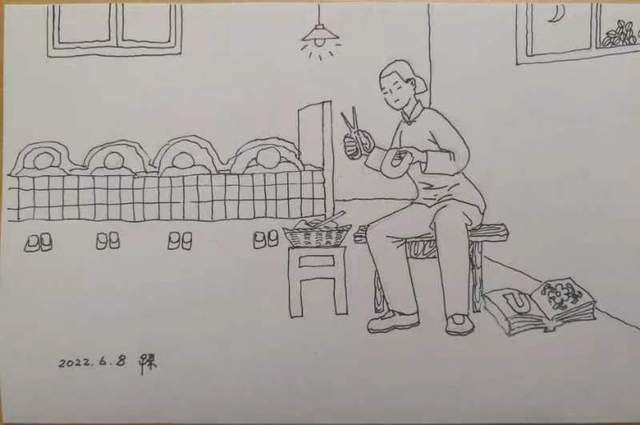 (圖16, 母親燈下為孩子們納鞋底做針線, 蓮君繪圖)