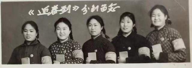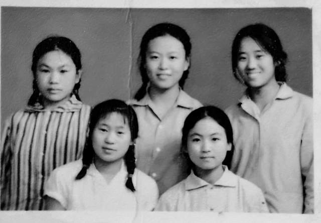 (歲寒三友的24級3班同學送她赴內蒙古建設兵團,前排田廣連, 紀紅, 後排張梅琴, 歲寒三友, 王玉蘭, 歲寒三友提供)