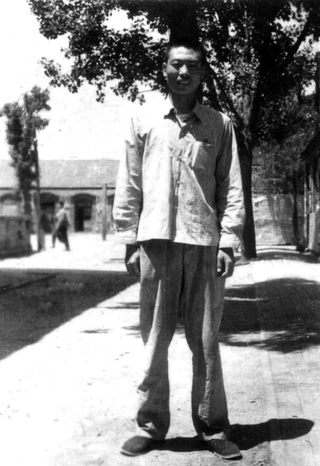 (图1, 一九六七年的济南二中校门, 玉海学长站在老校门口前, 学长玉海提供)
