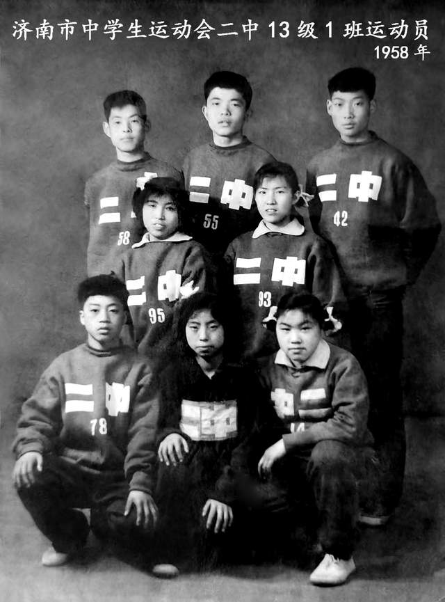 (圖11, 濟南市中學運動會二中13級一班運動員合影於1958年, 中間排右一为老學長尚鐵君, 照片由老學長尚老師提供, 謝謝)