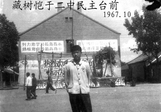 (圖9十九級五班同窗臧樹侃1967年於濟南二中教學大樓前的講台前, 那時稱為“民主台”, 很多場大辯論和批鬥會在這裡進行, 照片由老學長玉海提供)