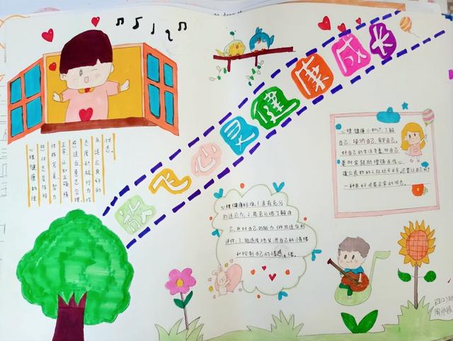 四是举行心理健康手抄报活动,你我齐动手,你找资料,我构图,他涂颜色,我写字。瞧,图文并茂,形式新颖,内容丰富,布局合理。有效的宣传心理健康知识,让学生从中学到了更多的心理健康知识。
