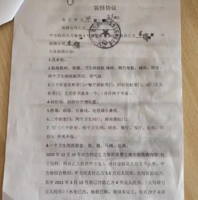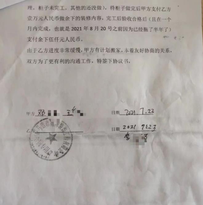 但是事情的发展并不像消费者想象的那般美好。驻马店市南海装饰工程有限公司在给消费者家装的过程中,不但进度缓慢,而且态度很差。截止到2022年4月6日,该公司完全不按合同履行,超过装修时间近一年依然没装修完毕,却把未完成的工作推辞不做,让消费者再另外找装修公司去干,却还一再催促消费者把尾款交完。