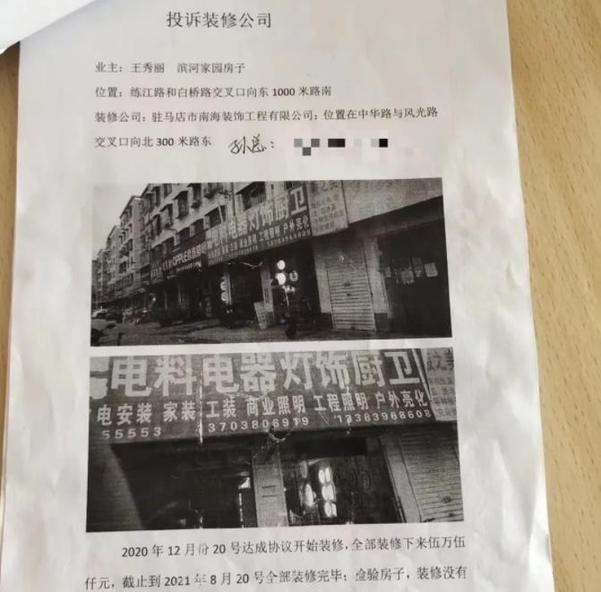 近日,市消维会接到消费者王女士的投诉称,她与2020年12月20号与驻马店市南海装饰工程有限公司达成装修协议,把家装的工程有消费者选料全包给该公司,全部装修款为55000元,装修公司保证于2021年8月20日全部装修完毕。消费者检验装修合格后,再把装修尾款5000元与装修公司结清。