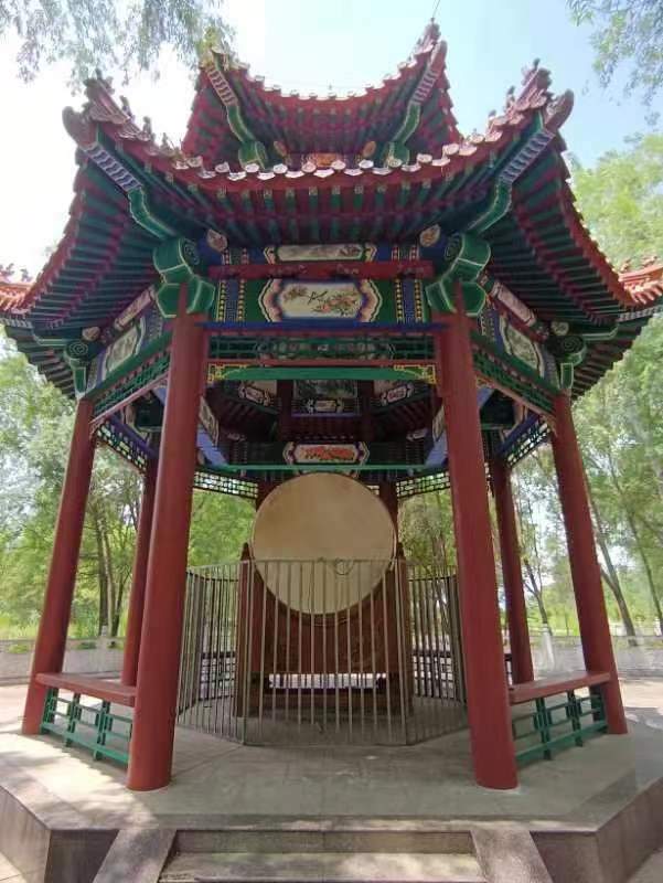 “四面观音”的西侧,有南北两个亭子,南面的亭子中擎有一“鼓”,故名唤“鼓楼”;北面的亭子中立有一“钟”,故名叫“钟楼”,不禁让人想起“晨钟暮鼓”的传说。