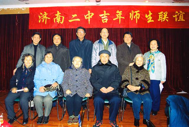 (图15 济南二中师生联谊, 前排左起刘学慧, 董世珠, 赵芝训, 付瑞藻, 杜慧茹, 后排张机, 饶克雄, 李景宽, 许玉祥, 宋加庚, 章德媛各位老师, 兴驰俊彩和秦玉海学长和提供)
