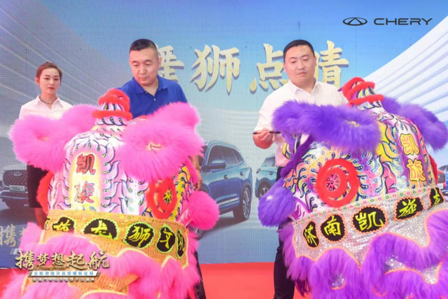 准备就绪只等风来,银楚集团董事长张立建先生,奇瑞汽车营销公司营销三区总经理宋国川先生一齐为醒狮点睛,寓意生机勃勃蒸蒸日上