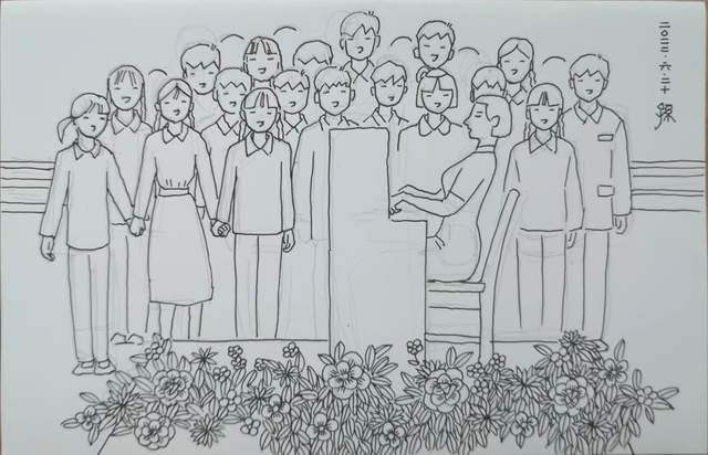 (图5-1 郑霄汉老师带领我们五班的同学一起唱《让我们荡起双桨》, 莲君绘图 紀念著名音樂藝術家喬羽先生仙逝)