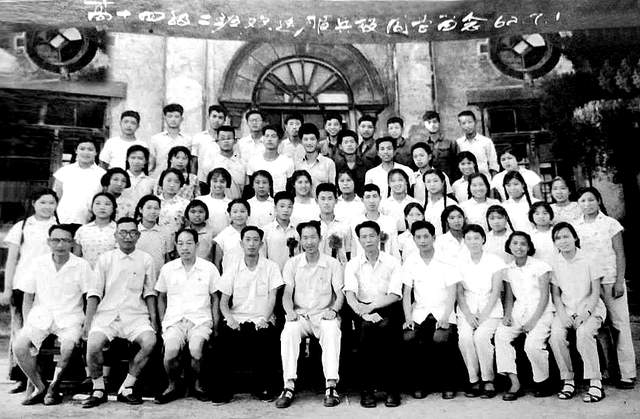 (图4 一九六二年学校领导和老师在大礼堂前, 欢送新兵入伍合影, 前排右六为华明校长, 右五李树源教务主任, 右四为彭兴沛老师, 秦玉海学友提供)