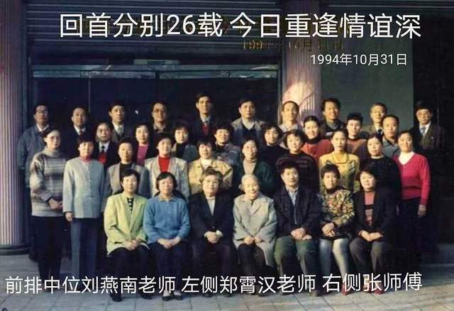 (图2 济南二中19947年10月, 回首分别26载, 师生重逢情谊深 , 前排中为刘燕南老师, 左侧为郑霄汉老师, 秦玉海提供)