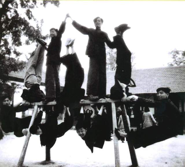 (图7. 一九五零年, 济南二中老同长在双杠上运动叠罗汉, 秦玉海学长提供)