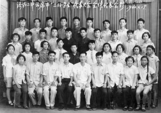 (济南二中校领导和参加济南市三好学生代表合影, 照于一九六零年六月, 前排右五为校领导华明校长, 秦玉海提供)