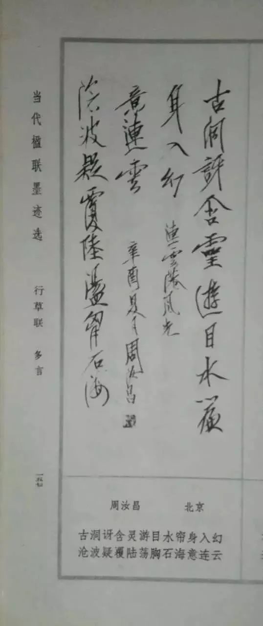 《当代楹联墨迹选》作品征集工作接近尾声时,陈凤桐细细查阅来件,发现尚缺部分名家作品,红学家周汝昌便是其中之一。于是,他就给周汝昌发了一份“征稿函”。不久,陈凤桐收到了回信,以及随信寄来的“古洞讶含灵,游目水帘身入幻;沧波疑覆陆,荡胸石海意连云”墨迹联作。信中写道:“……你们收到了如此丰富的对联,成绩可喜。从已经整理的联语而观之,有些是不懂联律的联文。联对必须对仗(包括字义、音律)……看来编选宜精,以勿贪数量为上策——要从长远观点、国际影响观点来考虑,以免贻人口实。要请懂格律的参加议事。祝工作圆满。周汝昌,1981年6月26日。”随信寄来的还有他认真填写的一份个人简介资料。
