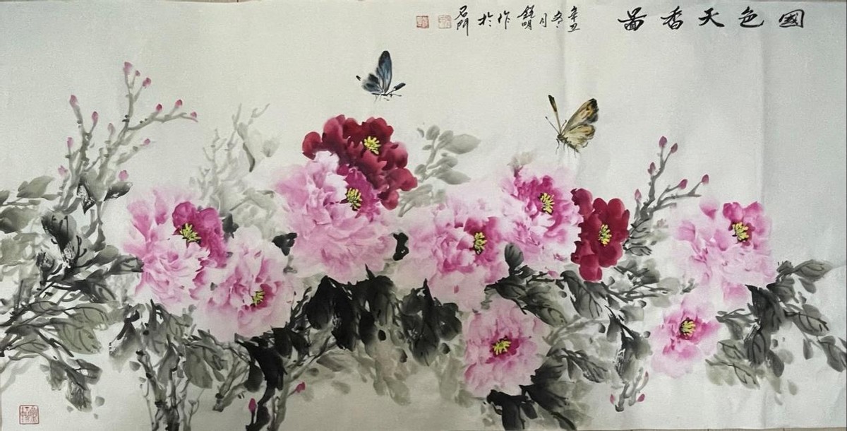 作品讲述:牡丹自古就是富贵之花,具有国色天香的气质。画家用没骨手法、淡雅的色彩画出粉色牡丹,加上几朵深色牡丹和飞舞的蝴蝶,彰显出了春天牡丹园的醉人景象。