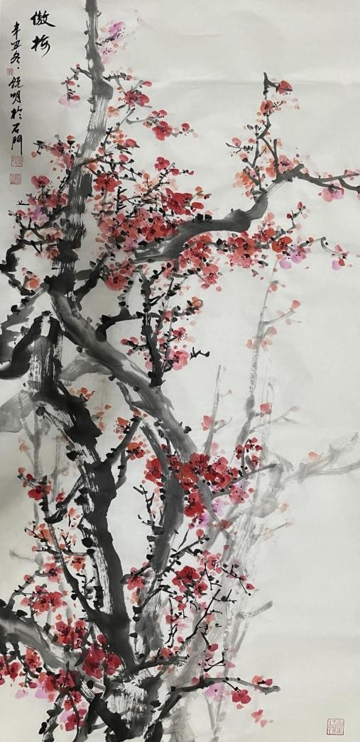 作品讲述:梅花是最超凡脱俗的花。她以一副傲骨毅然地开放在寒冬。画家用浓墨以粗框的手法画出了梅花苍劲的枝干。枝干是梅的主体,体现了梅花傲雪凌霜铮铮铁骨的精神。