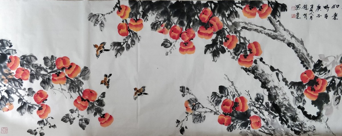 作品讲述:画家用写意的手法绘制了秋天红彤彤挂满枝头的柿子树,描绘出了硕果累累、小鸟嬉戏的秋天景象。“柿”字和“事”同音,寓意着事事如意、心想事成。