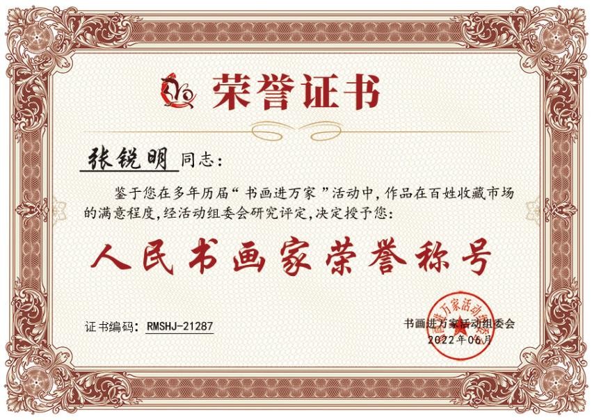 鉴于张锐明女士在多年历届“书画进万家”活动中作品被百姓收藏市场接受的满意程度,经活动组委会研究评定,决定授予其“人民书画家”荣誉称号。