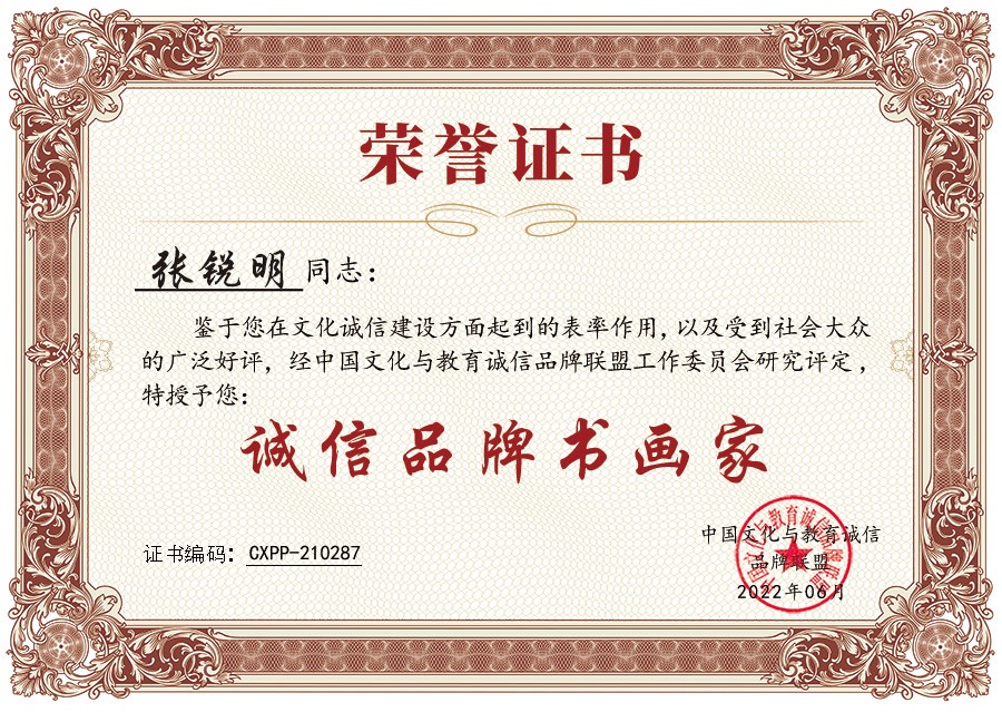 鉴于画家张锐明老师在诚信文化建设方面起到的表率作用以及得到社会大众的广泛好评,经中国文化与教育诚信品牌联盟工作委员会研究评定,决定授予其“诚信品牌书画家”荣誉称号。