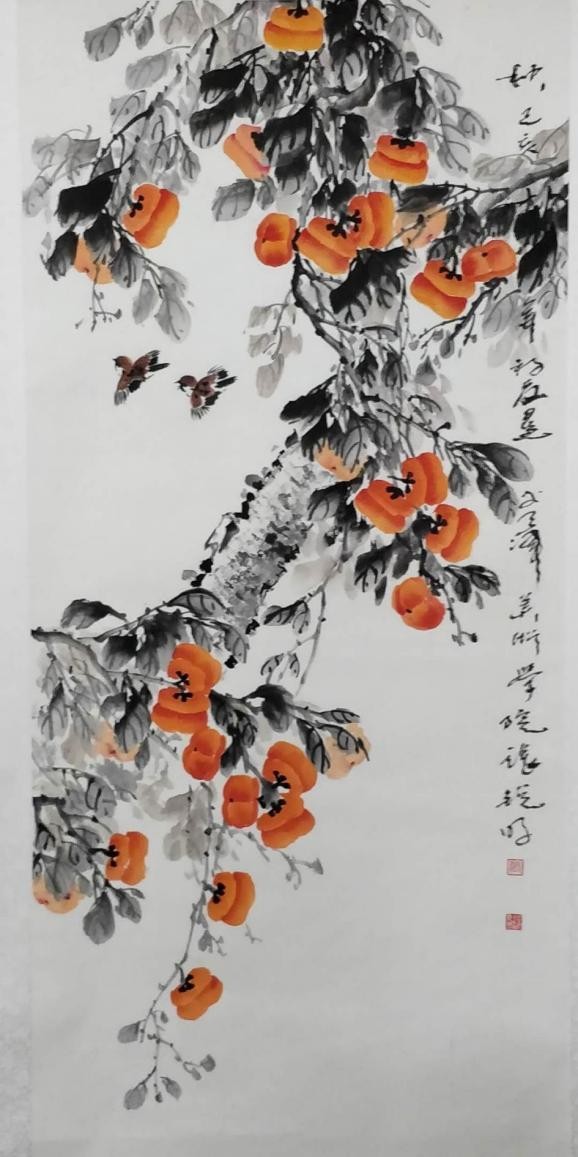 作品讲述:这幅画展现了秋天果实累累的柿子挂满了枝头的景象。画家用写意的手法,描绘出了硕果累累、小鸟嬉戏的秋天景象。柿子寓意着事事如意、心想事成。