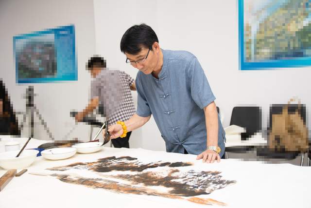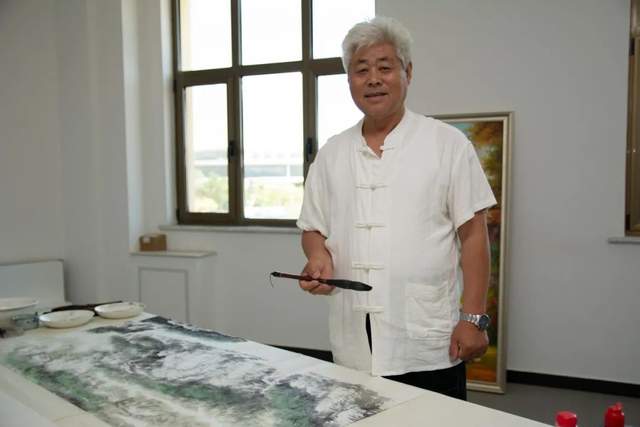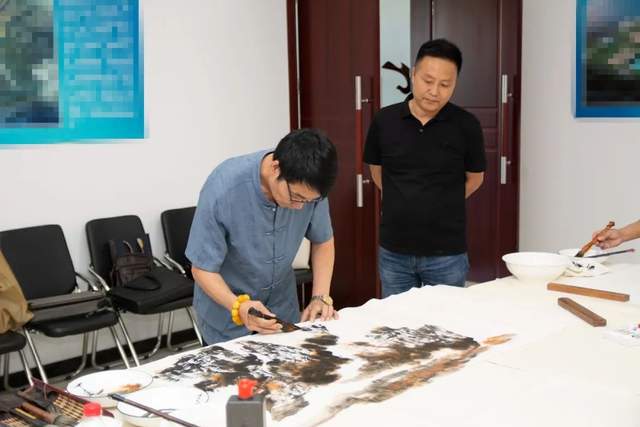 天津运河画院院长孟宪奎在现场山水画创作