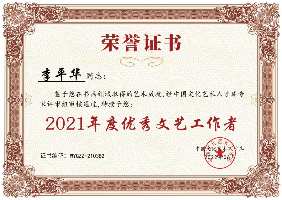 鉴于李平华同志在书画领域取得的优异成就,经中国文化艺术人才库专家评审组审核通过,授予其“2021年度优秀文艺工作者”荣誉称号。