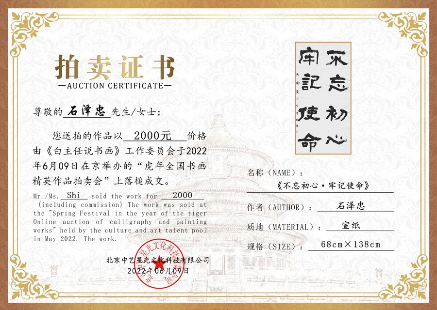 由中国文化艺术人才库组织的“虎年全国书画精英作品拍卖会第二十期”于2022年6月9日在京举行。书法家石泽忠的作品《不忘初心·牢记使命》在多轮激烈的竞拍中以2000元被藏友收藏。