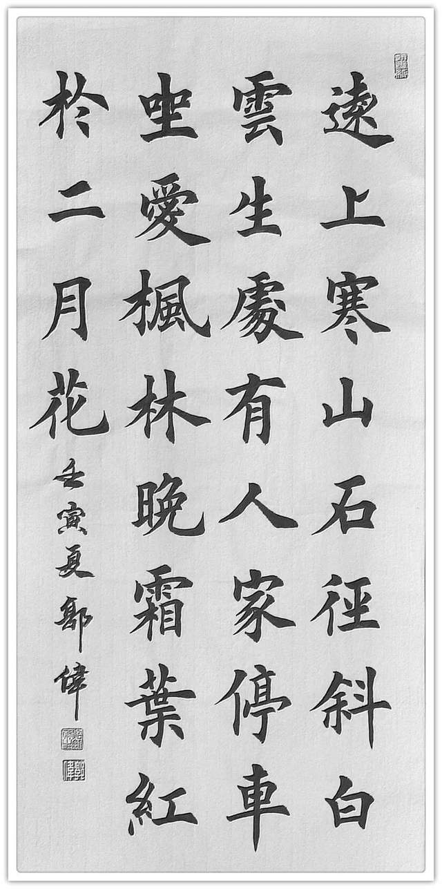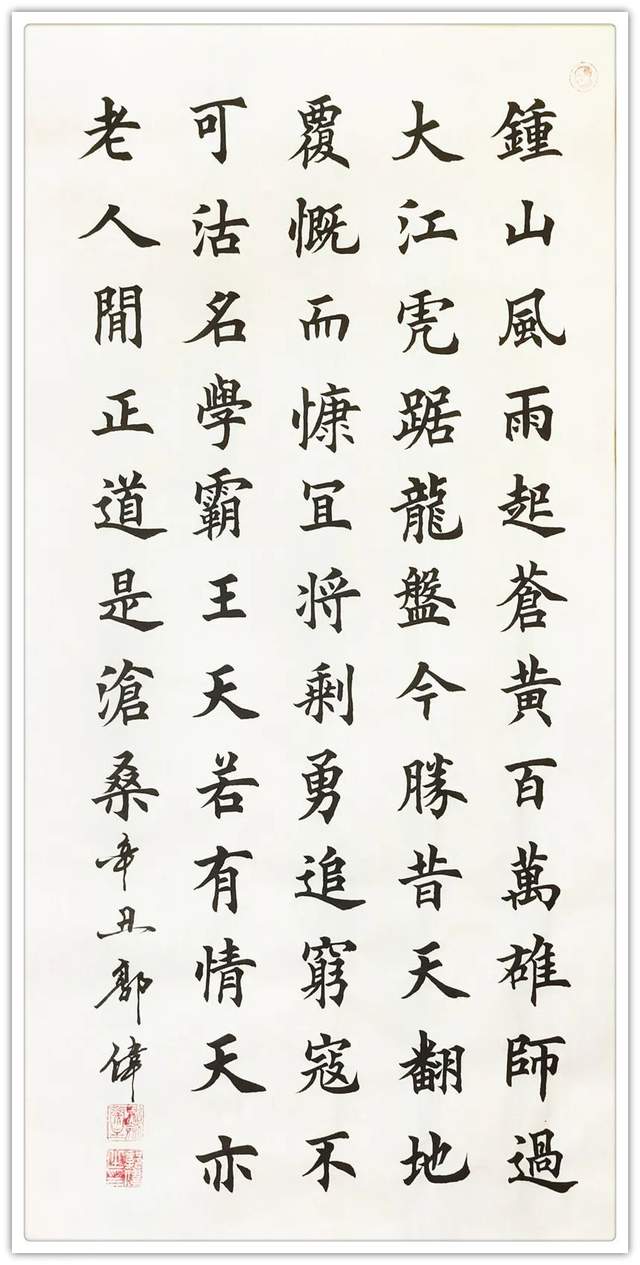 郭伟对书法的态度是恬淡的,没有信马由疆的张扬扇情,没有横泼坚抹的敷制铺陈,而是孜孜不倦,专心周正的向古人临贴悟道。他师从书法家马伟老师,形成了自己新颖的风格,也能体味“静”的深意,更能悟出其禅意,书法字如其人。郭伟的书法如同他的相貌,热情奔放,虎虎生威,行笔有力,笔墨纵横,率其放达。他不喜欢猶奇抢眼,装腔作势,他用貌似笨拙的运笔,传递着人间的温暖和暖意。这在当下物欲横流。郭伟的书法庄重典雅却不呆板。传统的书法家是多悲戚伤感,无病呻吟。他始终把笔墨的交点镇定在自己书德的对象上。
