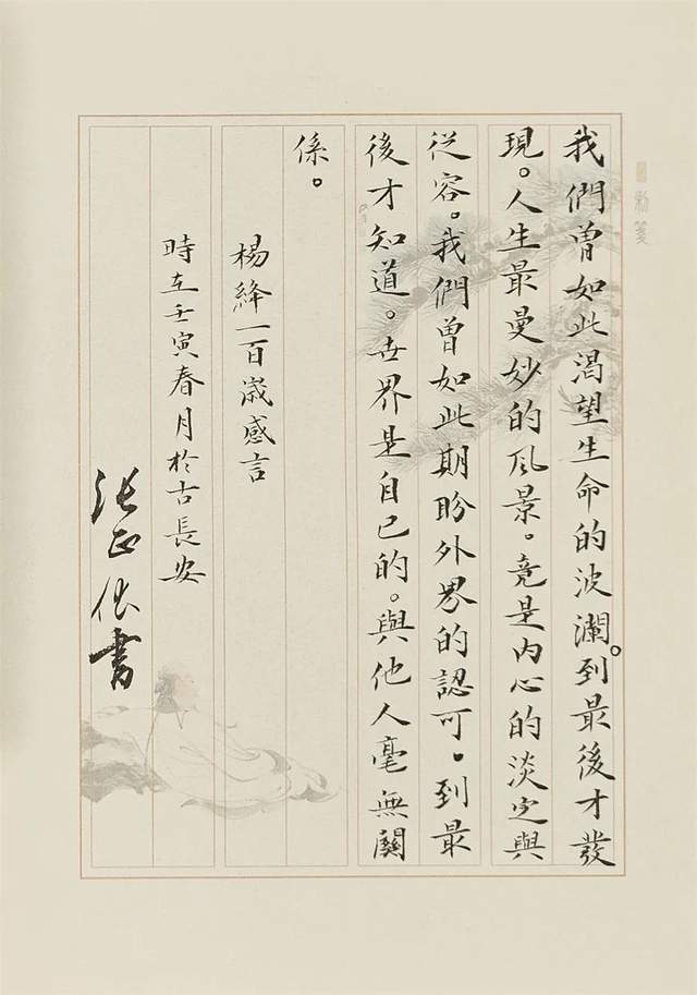 一个人最关键的是活出有精彩的自己 对自己有高度的思想追求 心经作品在多座寺庙收藏 修行修身 余生与书法相伴 提升自己的书法艺术水平 传播优秀文化 弘扬真善美 遵守社会公德 恪守职业道德 规范从艺行为。