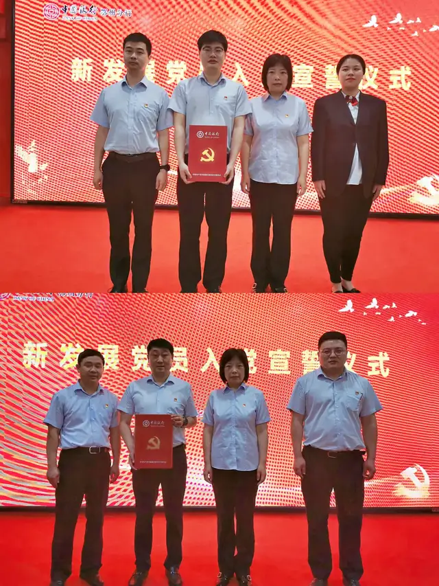 新发展党员党员刘俊、刘潇先后在党支部书记的带领下,在入党介绍人的见证下,面对鲜红的党旗庄严宣誓,并在入党誓词上郑重签字。党委书记、行长阮朝霞为新发展党员佩戴党徽,并赠送装有党章、党旗、入党誓词、笔记本、签字笔的礼盒。预备党员代表刘潇进行了发言。