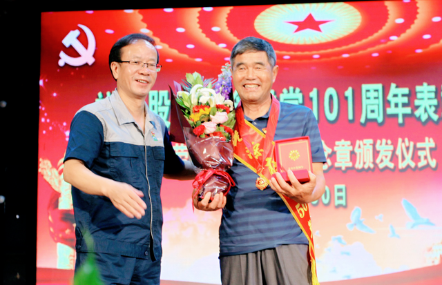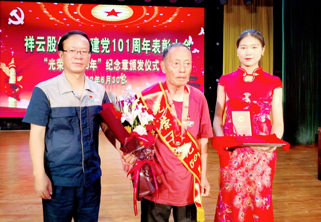在热烈欢快的颁奖音乐声中,祥云股份党委书记、董事长胡华文分别为五名老党员佩戴“光荣在党50年”纪念章,送上鲜花,每人发放1000元现金。并与老党员亲切地握手,向他们致以最崇高的敬意。