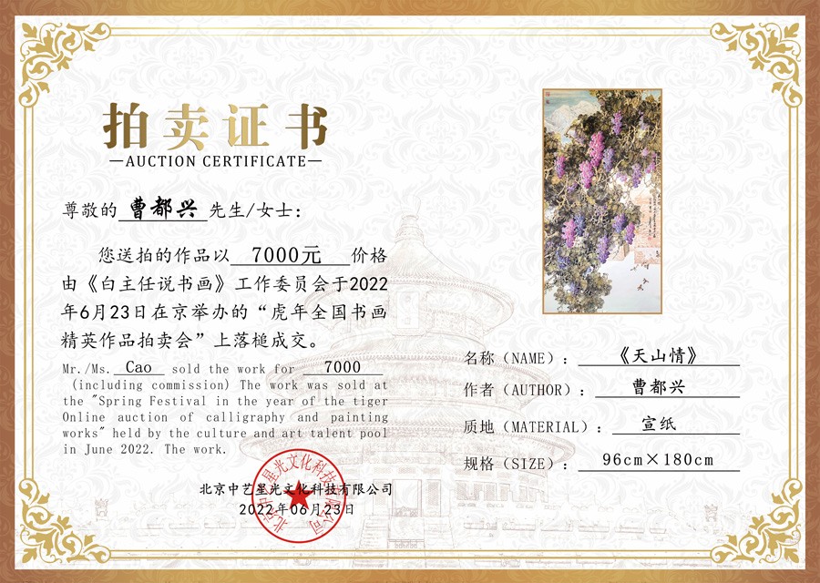 由中国文化艺术人才库组织的“虎年全国书画精英作品拍卖会第22期”于2022年6月23日在京举行。画家曹都兴的作品《天山情》在多轮激烈的竞拍中以7000元被藏友收藏。